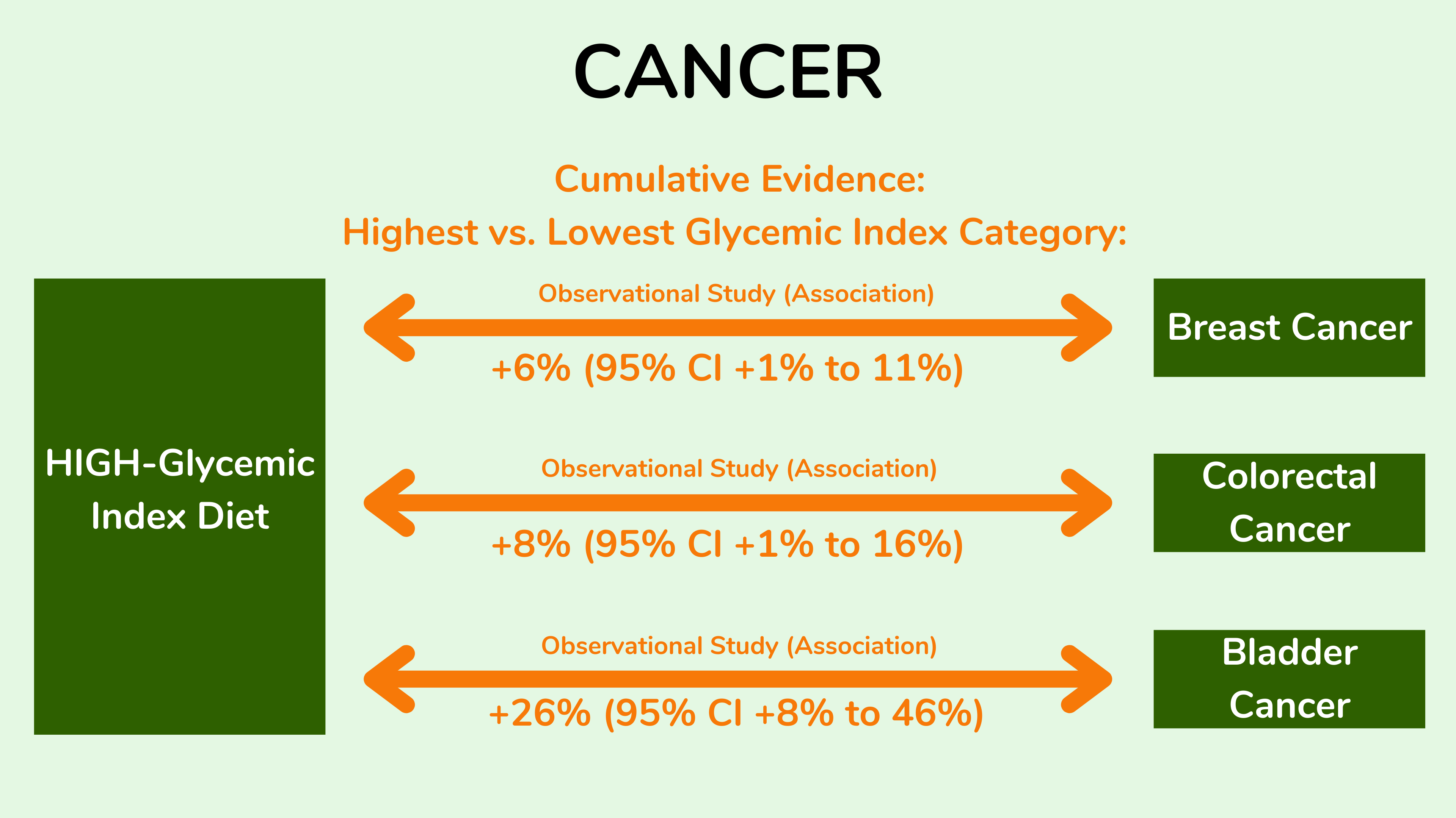 考虑到饮食的血糖指数,癌症是一个特别有趣的终点。这是因为大多数癌细胞主要以葡萄糖为食,而科学界的一个假设是,较高的血糖浓度将为肿瘤提供更好的生长环境。