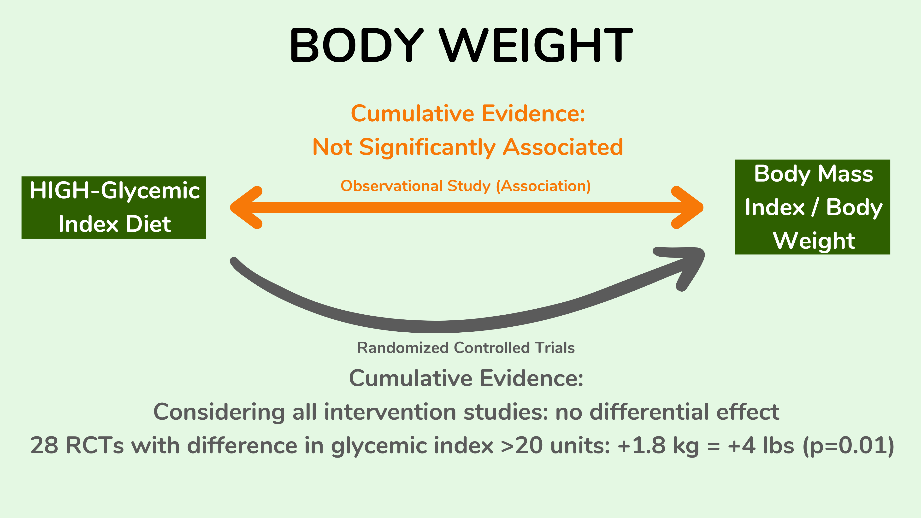 根据干预试验,高升糖指数饮食可能还会略微增加体重、胰岛素抵抗和血压,所有这些都是 2 型糖尿病、冠心病甚至某些类型癌症(包括某些类型的乳腺癌以及结直肠癌)的风险因素。这些来自随机对照试验的结果略微增强了我们的信心,即观察性研究中发现的关联可能反映了因果关系。