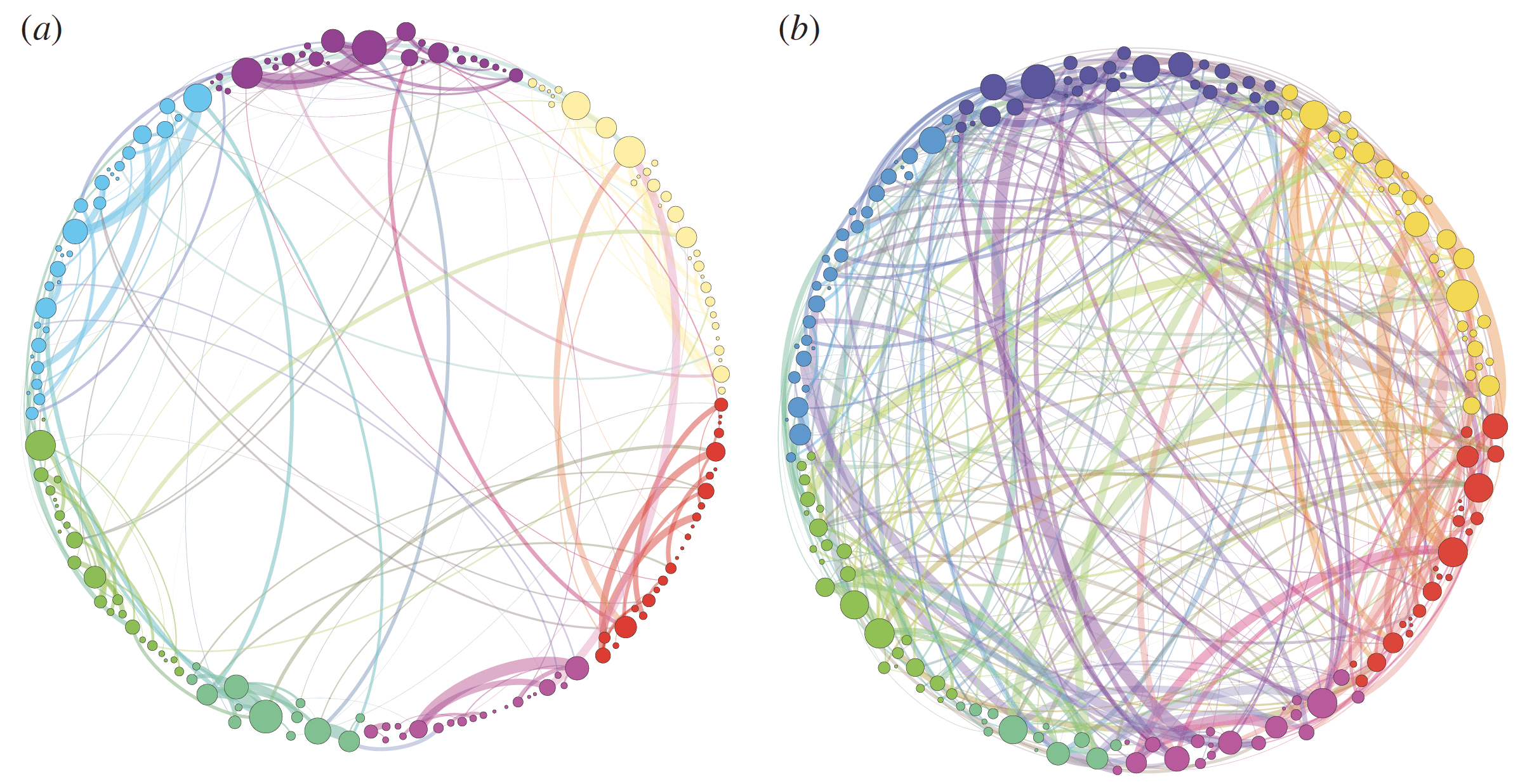 这是迈克尔·波伦 Michael Pollan 在《如何改变主意》中解释 DMN 以及上图中的并排图像,在 2014 年发表于*《皇家学会界面杂志》上的*,帝国理工学院团队展示了当默认模式网络离线并且允许熵潮上升时,大脑内通常的通信线路是如何彻底重组的。使用一种称为脑磁图的扫描技术,该技术绘制了大脑中的电活动图,作者制作了一张大脑在正常清醒意识期间和注射裸盖菇素后的内部通信图(如上图所示)。在正常状态下,如左侧所示,大脑的各种网络(此处描绘在圆圈内,每个网络用不同的颜色表示)主要是在自言自语,之间只有相对较少的交通繁忙的通路。